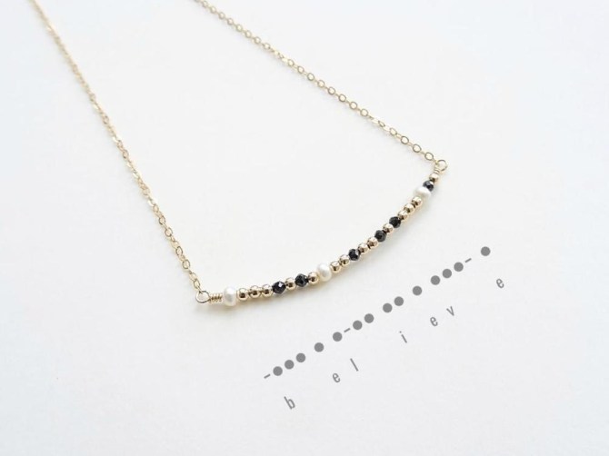Dainty Black Spinel, Freshwater Pearls Beaded 14K GF Morse Code Necklace