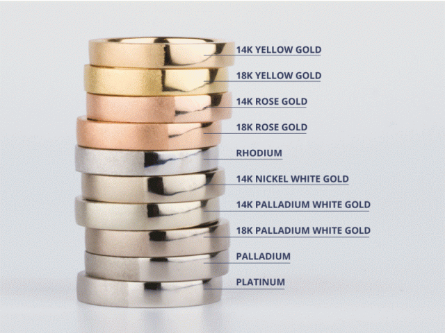 黃金為黃色貴金屬,化學符號「Au」,其密度高、柔軟、抗腐蝕,且延展性為已知金屬中最高的。而 K 金是指將黃金和其他金屬熔煉在一起的合金,因黃金柔軟的特點不適合鑲嵌寶石,因此通常會在黃金中加入銀、銅、鋅等金屬,增加其強度及韌性,如此製成的合金便稱之為「K 金」。按國際標準,K 金分為 24 種,即 1K 到 24K,24K 便是 999.9 黃金。18K 表示成分中有 75% (18/24) 的黃金,14K 為 58.5% (14/24) 的黃金含量,10K 為 41.7% (10/24),以此類推。目前世界各國採用的金飾材料多半不低於 8K,而 18K 和 14K 最為廣泛,近年盛行的日系輕珠寶則大多為 10K。為了豐富各種 K 金的表現力,在含金量標準不變的情況下,調節其它合金配比係數,可合成色彩各異的 K 金。據日本著名的首飾雜誌《寶石四季》報導,現在 K 金的配比有 450 種,最常用的有 20 種,例如,14K 中有 6 種:紅色、紅黃色、深黃色、淡黃色、暗黃色、綠黃色;18K 也有 5 種:紅色、偏紅色、黃色、淡黃色、暗黃色。