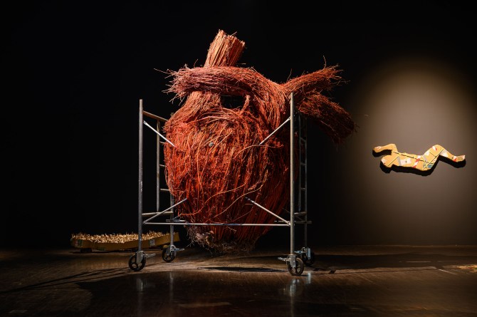 巴卡芙萊 Pakavulay 創作的《靈魂歸屬地》sarapung,那一顆原始粗曠的心,很震撼,以下為展品的官方簡介:藝術家將下賓朗部落族人身後的靈魂歸屬地——賓朗四格山,轉化為由紅藜、藤蔓和竹枝拼組而成的心臟與血管的意象,立撐於鷹架上,敘事在這個主流社會,標榜尊重多元族群政策下搶救的文化之心,到底是為了誰?那些穿梭於摩天大樓鷹架上工作的原住民與移工,俯視著自己蓋過的樓房或許也泛起類似疑義的叩問?
