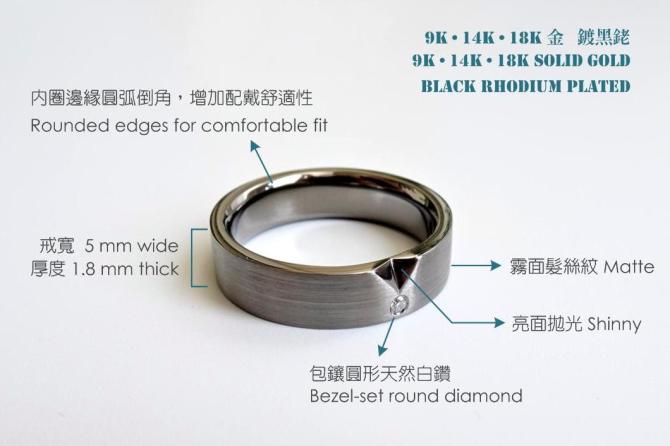 白 K 金是由純金添加鈀、銀等熔合製成,由於基礎成分為黃金,其本色一般呈現些微的米黃色調,因此大部分的白 K 金珠寶表面會鍍上一層銠 (Rhodium),除可增加類似鉑金的色澤與亮度,且能提升金屬本身的強度與韌性。而黑銠 (Black Rhodium) 是在銠中加入其他配方,讓顏色變成黑色,此為生產電鍍液廠商的商業機密,所以無法確定有哪些成分,廠商僅告知不含鎳等致敏物質。無論電鍍黑銠或是銠原色,電鍍層經過配戴後可能逐漸磨損而顯露白 K 金本色,可以重新電鍍修整,以這款戒指來說,大概就是收取幾百元的材料工本費。