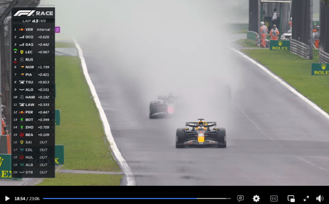 隨著雨勢變化,賽道狀況不穩,賽中一度因各種意外而出現黃旗及虛擬或實體安全車,其中一次安全車的出現為 FIA 因憂慮大雨導致車輛發生意外而主動提出,許多車迷因此抗議 FIA 過度介入。Williams 車手 Colapinto 在第 32 圈發生事故後,紅旗出現,賽事暫停,所有車輛回 Pit 整裝待發,未換過輪胎的得以在不耗損時間之下,免費換胎,這是另一個爭執點,套句 Norris 在 team radio 所說:I guess everyone can change tyres for free now. 即便如此,無論如何,私以為排除運氣和機會,技術仍在大雨出賽中佔據絕對主導地位,在眼前車尾視線所及一片白茫茫水霧,在車胎一擦到賽道白線就會完全失去抓地力而打滑失速的情況下,全程高速賽車,需要多精準的控制和預判啊!小白結語:太精彩啦!