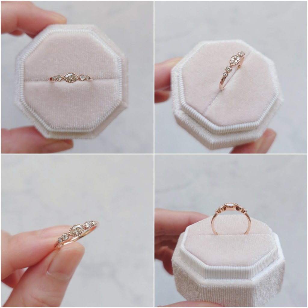這次 K 還帶了一支母親留下來的戒指,上頭原鑲有七顆馬眼形切割鑽石,陸陸續續已被拆下六顆。最後一顆馬眼鑽,我們決定搭配幾顆小鑽,採用小復古格調的珠邊鑲,做成一支日常配戴的玫瑰金細戒。對了,老件的金屬都直接回收扣抵訂製費。至此,舊換新工程,圓滿結束。