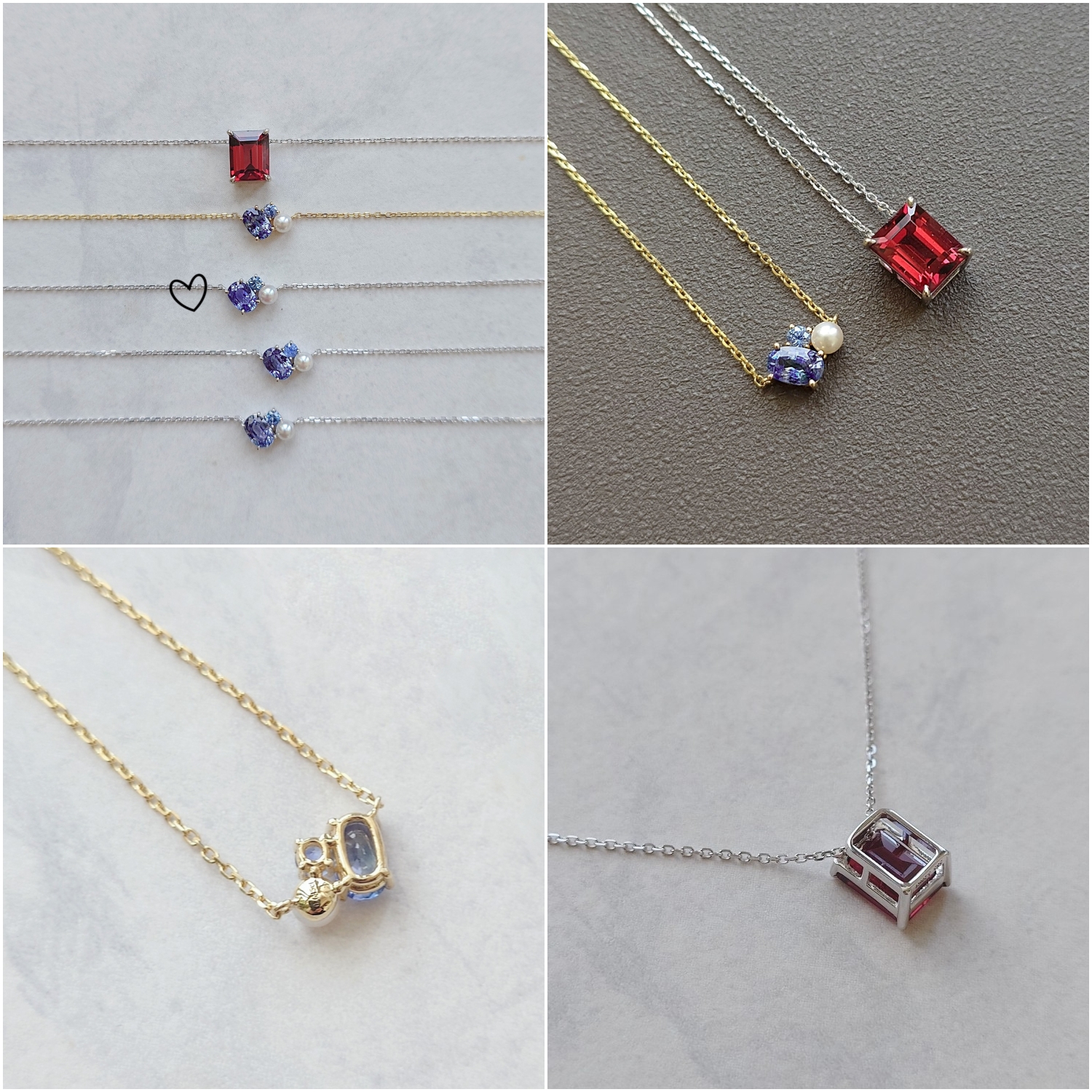 委託人們一開始便決定將坦桑石和珍珠配對,額外加上一顆圓形切割的小配石(最終選定淺藍寶),做成 trio gem 項鍊,而石榴石則單獨做成一條項鍊,總共五件訂製。替成品拍照時,發現坦桑石和淺藍寶竟然自己組團成一個愛心,也太可愛了,是無心插柳的意外之喜!這便是家族珠寶的真正意義,關於愛的傳承。死亡與新生相倚,是人生不變的輪迴,是我們都無法對抗的自然法則。聆聽 K 敘說老件珠寶的背景故事時,特別羨慕她們姊妹們的好感情,必須有這樣的牽掛和羈絆,才會萌生留下些甚麼的想法。