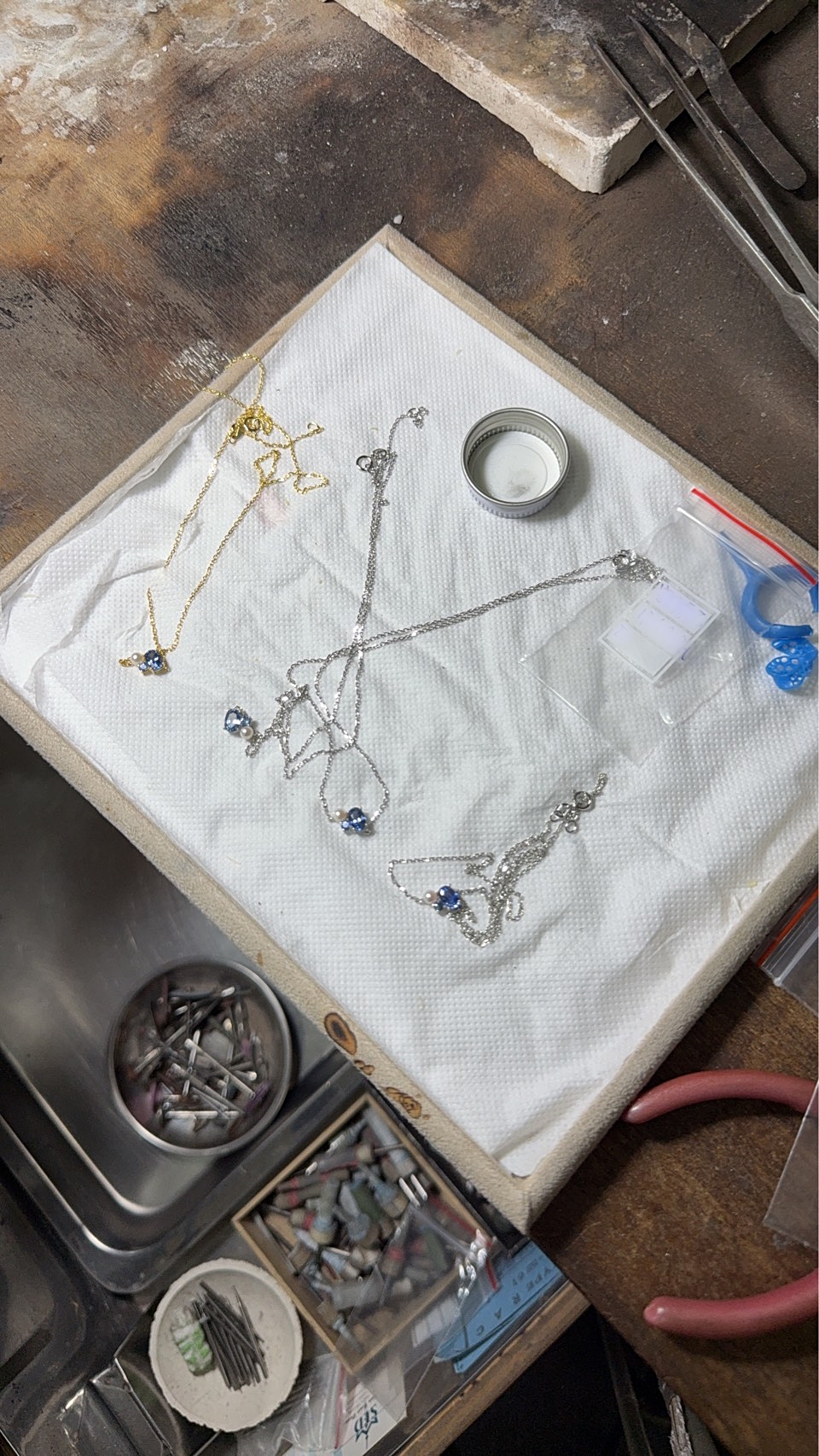 補一個師傅完成項鍊時的工作檯,金工夥伴的直男拍攝,沒有甚麼文青情境擺拍,也沒有甚麼專業打光取景,就是這麼樸實無華(雙手一攤)。夥伴:做好了,你看(驕傲)。老闆:嗯,數量正確 😑(這個糢糢糊糊不清不楚是要怎麼傳給客戶看,差評)