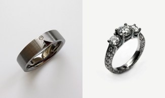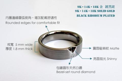 成品相當令人驚喜,經過客戶同意,我們決定也開放黑色選項給其他欲訂製本款戒指者,並趁歲末年終最後一發文與大家分享這件極致低調的設計。下面左圖為成品,戒指經過黑銠電鍍後仍呈現金屬光澤,而非如黑色烤漆般墨黑暗啞,硬要比喻的話,就是類似自然界黑膽石 (hematite) 的顏色。同時,無色透明的鑽石鑲嵌在黑底之上,整體呈現更為低調神秘,可參考下面右圖鑲滿鑽的婚戒,是不是特別有個性!