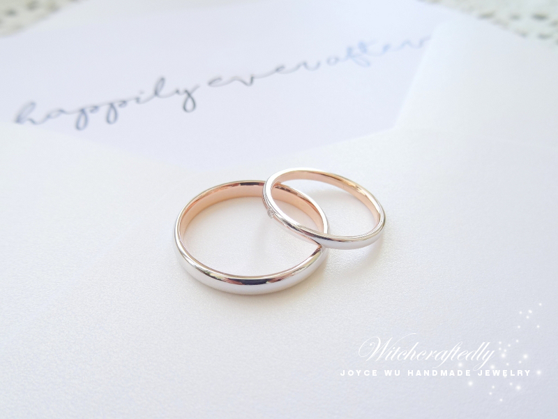 接著,奇妙的事發生了,六月的某日,認識多年的 P 突然捎來訊息詢問對戒訂製。就在一切準備就緒之際,我們得以欣喜自信地接下這項任務,真是太棒了 — timing is everything!新嫁娘本人擁有敏銳的時尚感,以及直爽俐落的個性,以簡單舒服為訂製原則。從她挑選的幾件基本款中,我們幾乎是立刻鎖定其中一款做為基礎,然後依照新人的需求規格,交由師傅手工鑄造,乾脆不囉嗦。戒台為 18K 白金與玫瑰金雙層組合,女戒上包鑲了一顆小鑽,極簡中隱隱透露細微的變化。希望成品是新人心中所想,這一切都令人興奮極了!