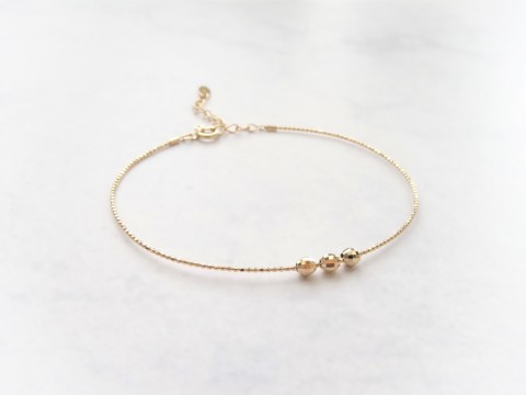 這款看似簡單無奇卻暗藏玄機的 18K 金極細軟式手環,從確認樣式、下單製作到成品產出,費時超過兩個月,期間工廠也忍不住叨念了句:沒做過這麼細的手環 (憂心忡忡貌)。原本估計拍板定案後一個月便可交貨,而正當我們興奮於即將看到成品時,卻突然收到延遲的消息,工廠的解釋不容反駁:必須測試強度。不過,折折騰騰後的完成品相當令人驚喜,粗僅 0.8 mm 的極細手環完全符合我們設定的輕珠寶概念,手環本體由 18K 金包覆記憶鋼圈 (memory wire),強韌、柔軟、富彈性,擠壓後可恢復原狀 (寫到這邊總覺得是打起甚麼 bra 廣告來著 XD),而為增添配戴彈性和實用性,尾端加了一段輕巧的延長鍊。最初的構想是素素一圈甚麼都不放,後來左思右想實在覺得必須為這條裸感手環刷一點兒存在感,末了決定串進幾顆店內招牌菜 — 迷你切面金珠。潘朵拉檔珠式的迷你切面金珠約 3 mm 大小,內裝矽膠墊,可自由移動位置,若要營造素面手環的效果,可將小珠全都移到後方近扣頭處。