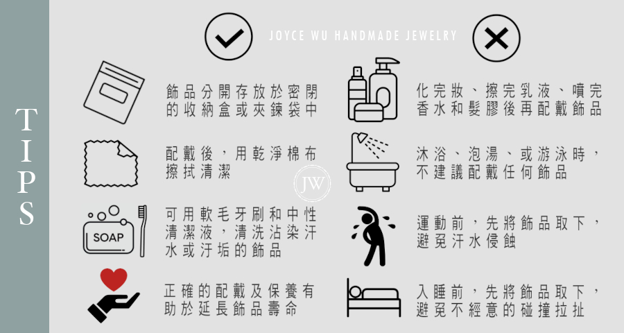 - 配戴建議:任何首飾一律不建議戴著沐浴、泡湯、游泳、運動,避免接觸溫泉、海水、游泳池氯水、清潔劑、或其他化學物品,以免飾品表面產生化學變化或遭受侵蝕。著裝時,配戴飾品應為最後一個步驟,應於化完妝、擦完乳液、噴完香水和髮膠後再配戴首飾。更衣或入睡前,應先將首飾取下,避免飾品因不經意的拉扯碰撞而斷裂或脫落遺失。